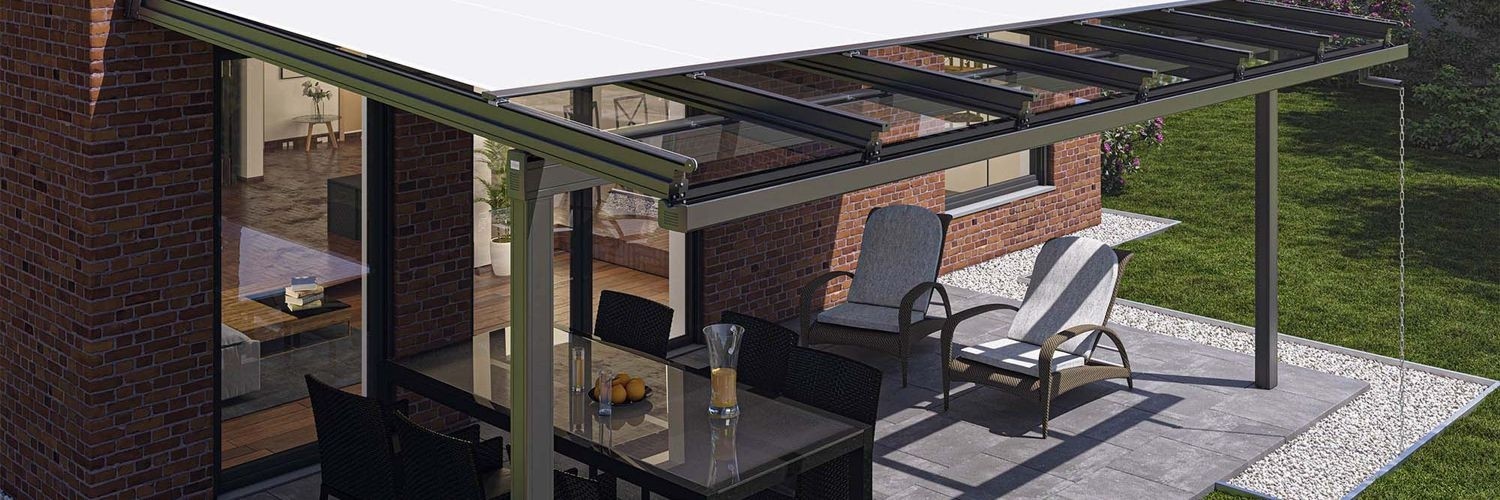 Tarasowy dach szklany z bezpiecznego szkła laminowanego LSG grubości 8,10 lub 12 mm, ze zintegrowaną markizą przeciwsłoneczną. Zabezpiecza taras przed słońcem, deszczem i śniegiem - całoroczna ochrona. Odporna na korozję wysokiej jakości aluminiowa konstrukcja.