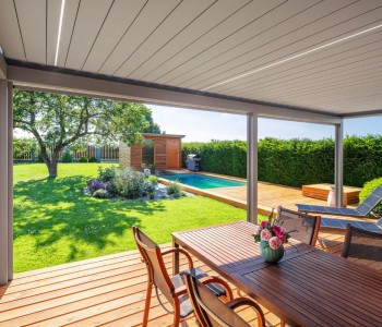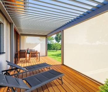 Masywna konstrukcja pergoli lamelowej pozwala na zastosowanie zabudowy bocznej - szklanej, za pomocą rolet Screen lub obu tych opcji naraz.